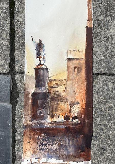 Al día siguiente, 18 de julio, tuvimos la suerte de acompañarle en una jornada de pintura al aire libre por Gijón, concretamente en los alrededores de la Plaza del Marqués. Vicente pintó tres acuarelas a lo largo de la mañana, demostrando una vez más su gran maestría:
