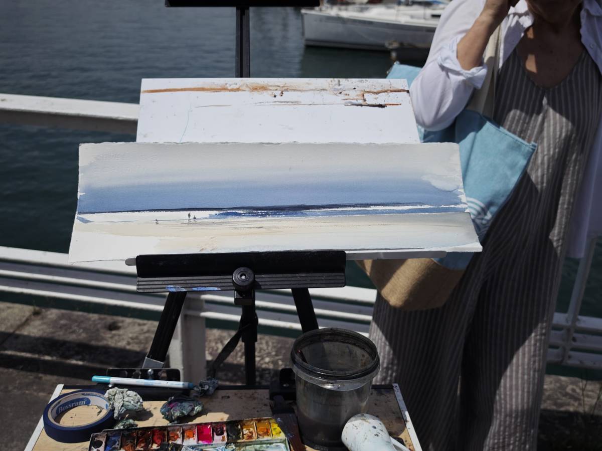 El 17 de julio, Vicente realizó una magnífica demostración en el salón de actos del CMI de La Arena, centrada en la pintura de un paisaje marino. Durante la sesión, explicó aspectos clave como la composición, la elección de la paleta de colores y la importancia de reservar los blancos en la acuarela. En poco más de una hora, completó una impresionante de formato grande utilizando la técnica de húmedo sobre húmedo, dejando al público fascinado por su destreza y claridad didáctica.