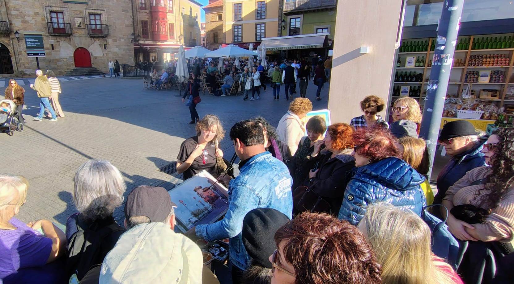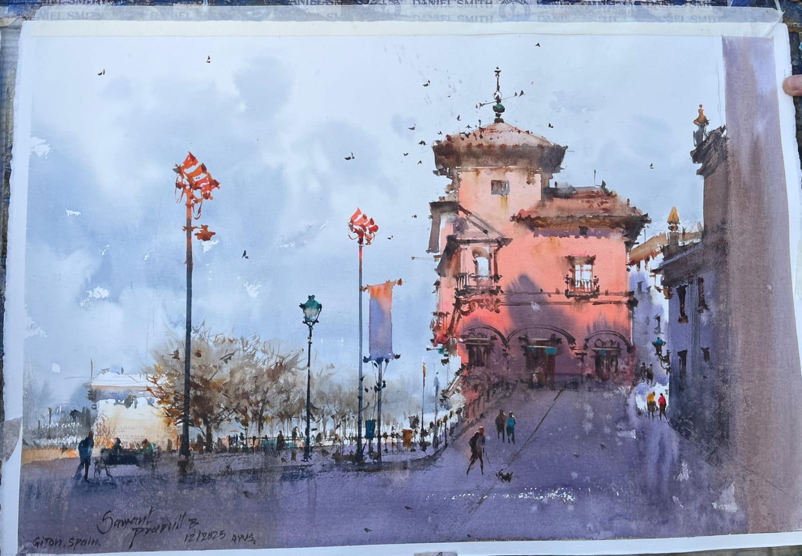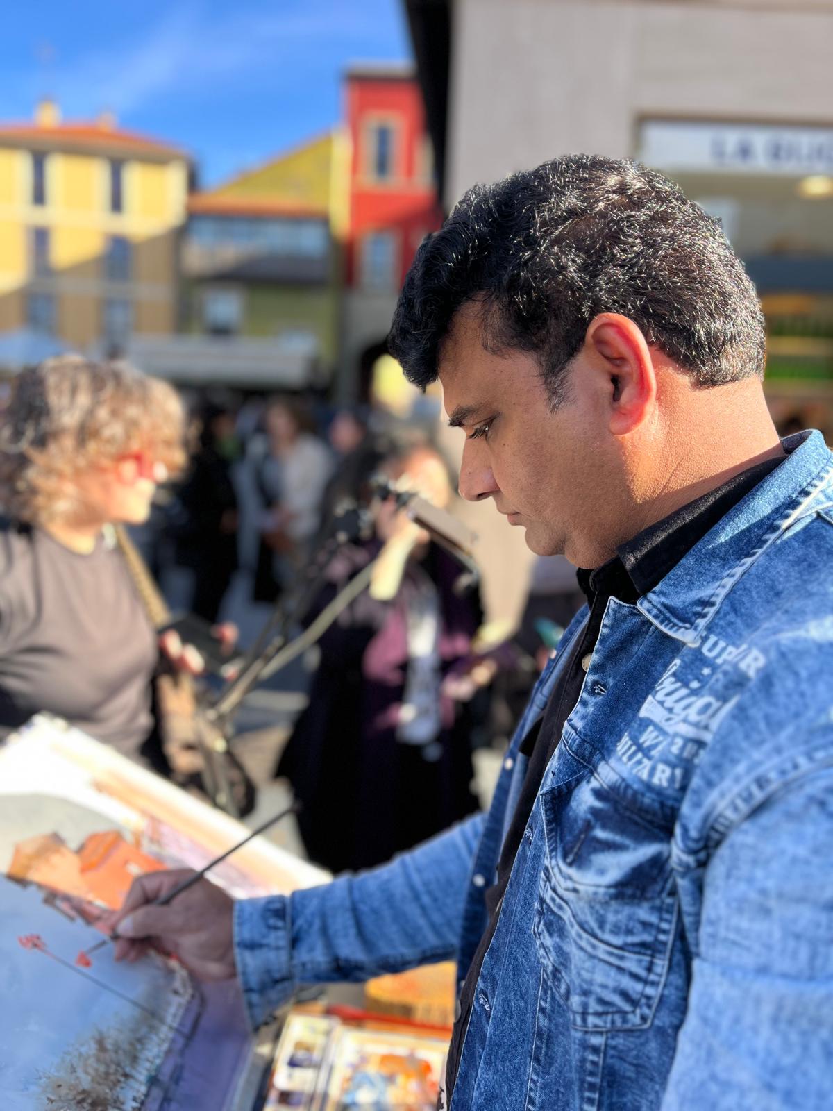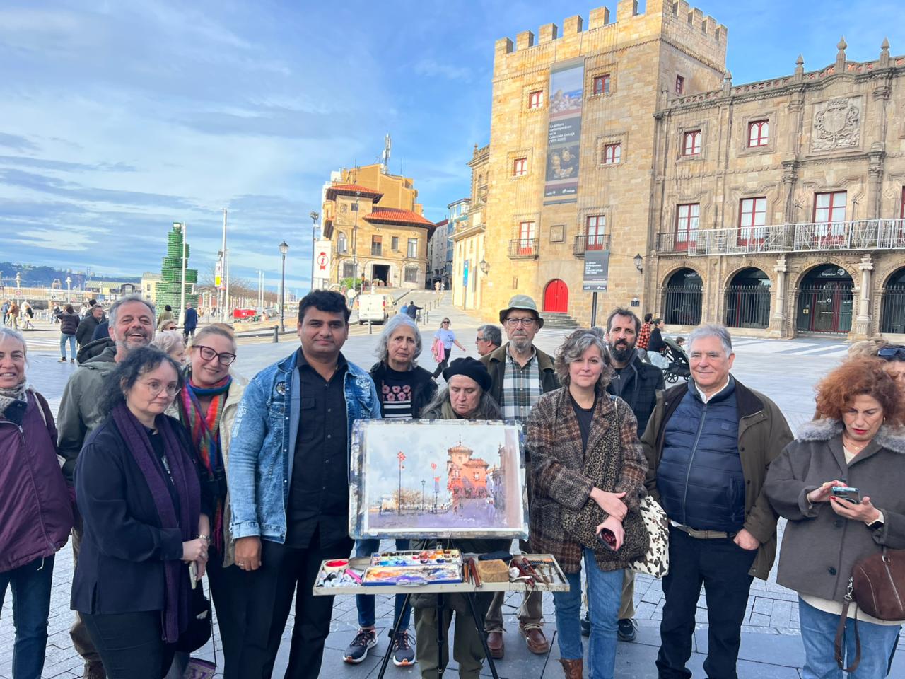 Para cerrar su visita, el lunes 8 organizamos una actividad de plein air en Gijón, que tuvo una gran afluencia. Pintamos en los alrededores de la plaza del Marqués, donde Prafull realizó una acuarela del Edificio Paqué, con su estilo personal. Fue una jornada muy especial.
