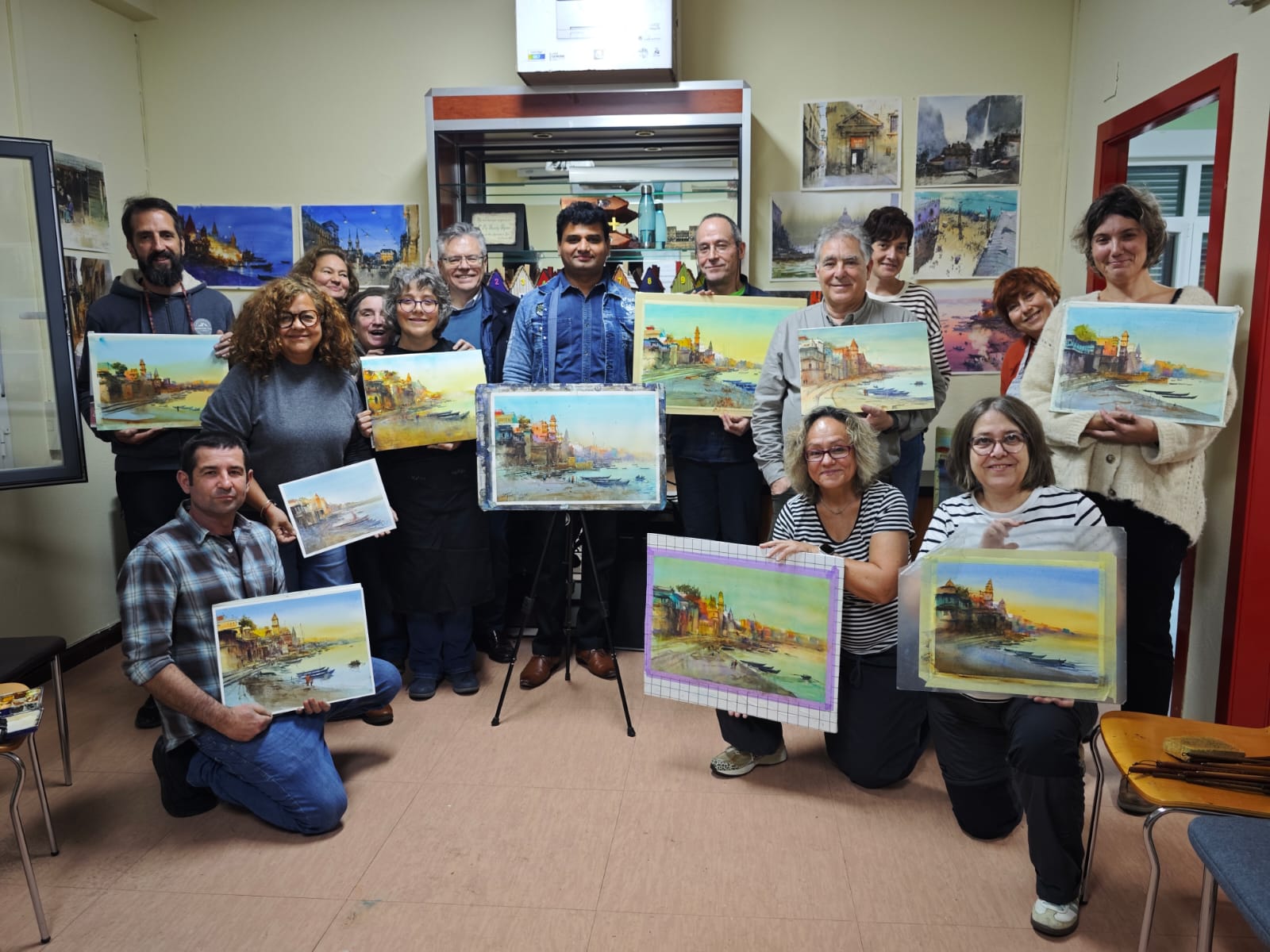 El sábado impartió el primer día del curso. Comenzó con una demostración en directo poco a poco, pintando una acuarela de un lugar de la India (Varanasi Ghat) que él mismo ha representado en numerosas ocasiones y que forma parte de sus obras más conocidas. Los participantes pudimos repetir la misma escena, guiados por sus explicaciones y recomendaciones.